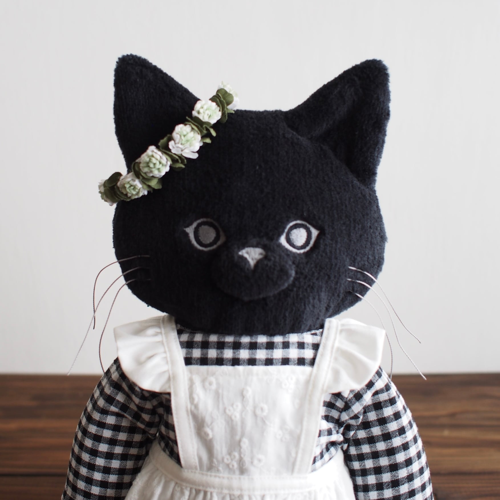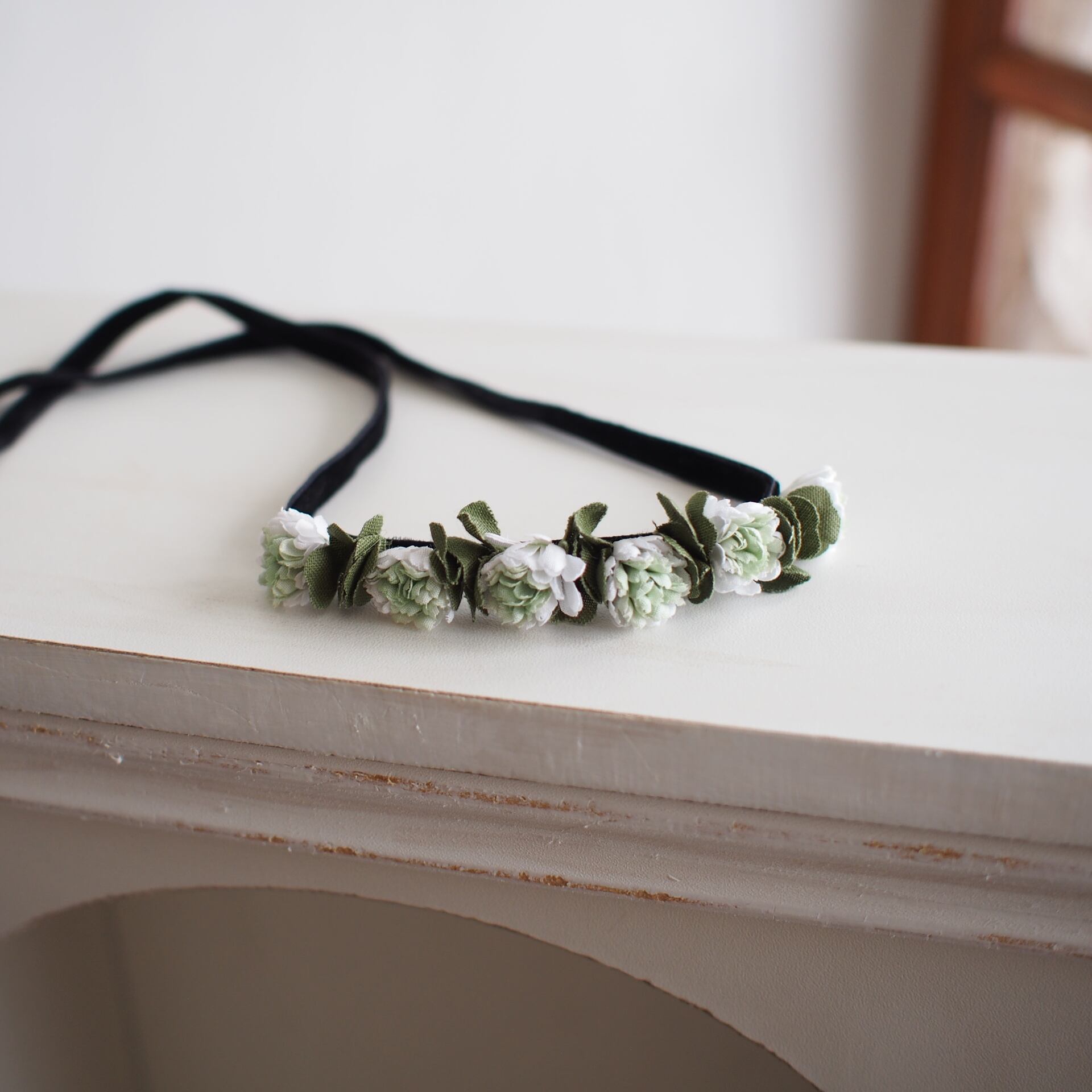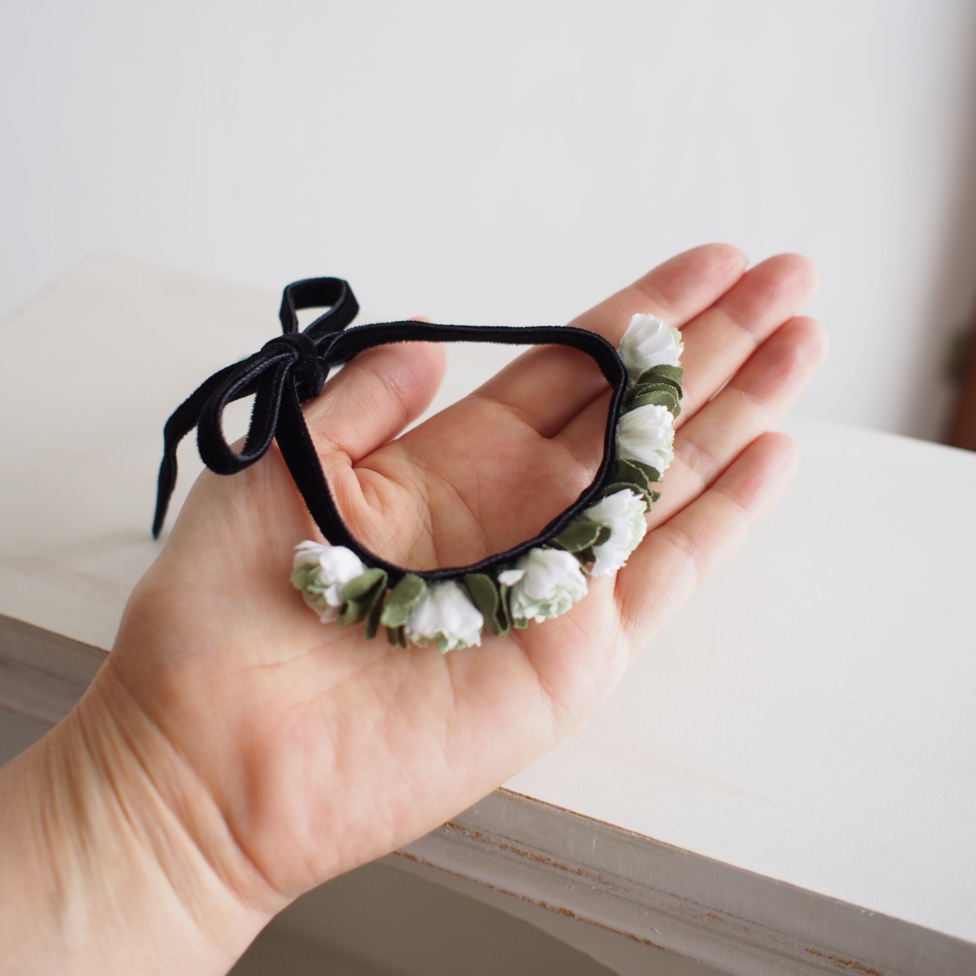 素朴でクラシカルな雰囲気のシロツメ草の花冠をイメージし、黒のベルベットリボンにお花をひとつひとつ接着しています。