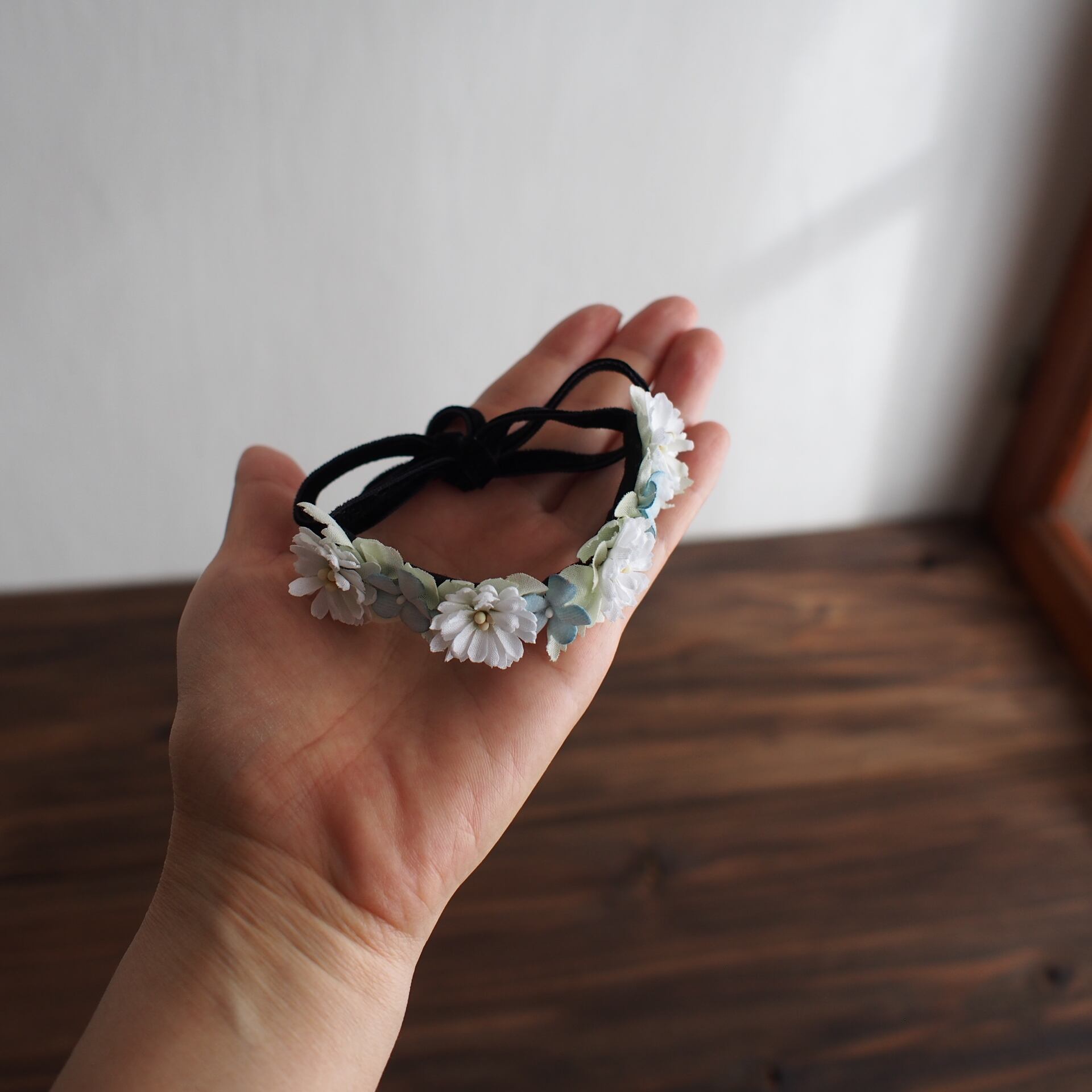 黒のベルベットリボンに土台布を付けてお花をひとつひとつ接着しています。